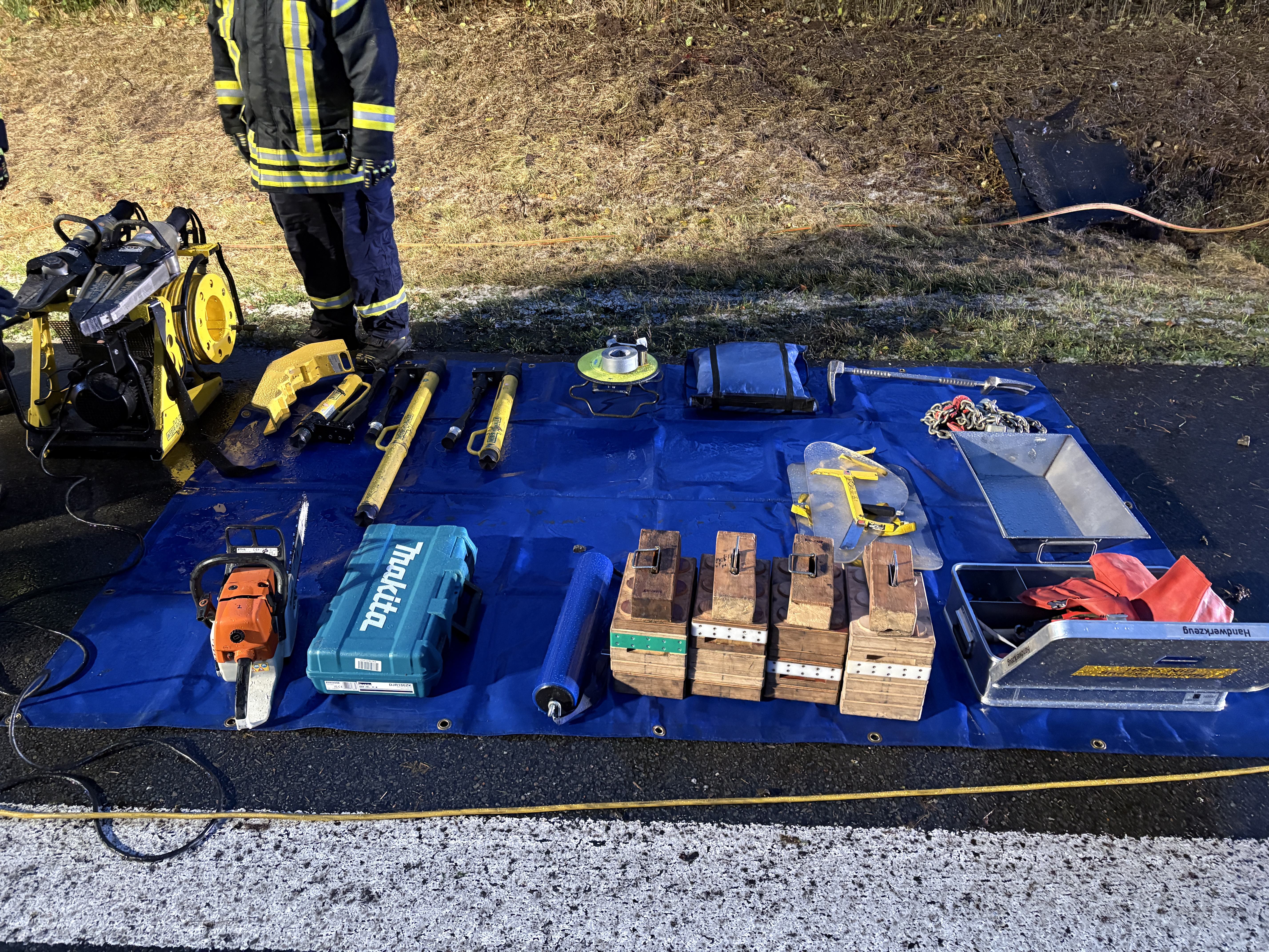 Vor Ort fanden die Einsatzkräfte das Fahrzeug so in den Böschungsstreifen verkeilt vor, dass der Zugang erheblich erschwert war. Um den eingeschlossenen Fahrer zu erreichen, wurden links und rechts des PKW Sträucher mithilfe einer Motorkettensäge entfernt. Anschließend konnte der Fahrer über die Fahrertür sicher befreit werden.